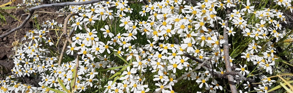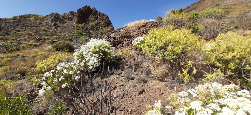 A mediados de primavera, finales de abril, pero con temperaturas de verano, 25 grados, nos encontramos en la medianías y en las cumbres de las islas auténticos mantos blancos desde lejos, si nos acercamos, se combina con el amarillo anaranjado.