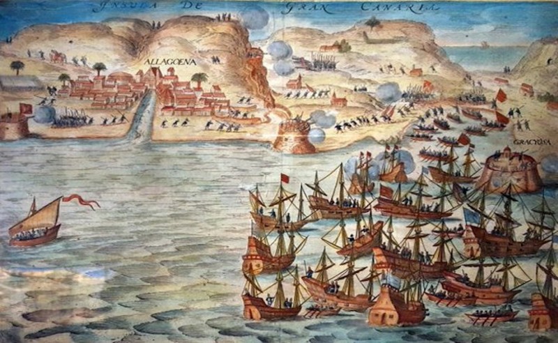 El 26 de junio de 1599, la flota se dirigía hacia la bahía de Las Palmas, tal y como narra el historiador Rumeu de Armas en Piraterías y ataques navales contra las Islas Canarias (1948), (Descargar este libro al final del artículo)“la población de la ciudad sumaba apenas 5.000 habitantes, la isla 15.000, y las fortificaciones, como la muralla que la rodeaba o el castillo de Las Isletas, eran escasamente válidas”. Van der Does tenía el objetivo de apoderarse de Las Palmas, “exigir un importante rescate a cambio de liberar a la ciudad del saqueo y la destrucción, apresar a las autoridades de Gran Canaria para asegurarse el dominio político y, una vez ganada la batalla, utilizar la isla como plataforma para extender la soberanía holandesa sobre todo el Archipiélago”.