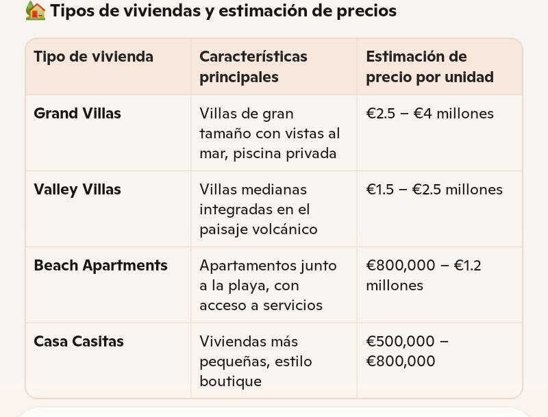 Cuna del alma ocupa 437.000 metros cuadrados. El nuevo complejo se ubica cerca del pequeño puerto de Puertito, cerca del conocido Adeje y, un poco más lejos, de Playa de Américas. Se construirán un total de 420 residencias en las laderas que se inclinan hacia el mar. La primera fase, cuya finalización está prevista para 2025, incluye 108 viviendas(?): 36 Casitas (?) (de 1 a 4 dormitorios), ¡¡ ¿como serán las «casitas en Bélgica entonces?», con superficies de entre 85 y 129 m², 32 Apartamentos de Playa (de 1 a 3 dormitorios), donde la nave de Galindo y el resto del barrio, con superficies de entre 80 y 163 m² , 20 Villas del Valle (de 1 a 4 dormitorios) con superficies de entre 139 y 349 m², y 18 Villas Grand (de 3 a 4 dormitorios) con superficies de entre 432 y 650 m²